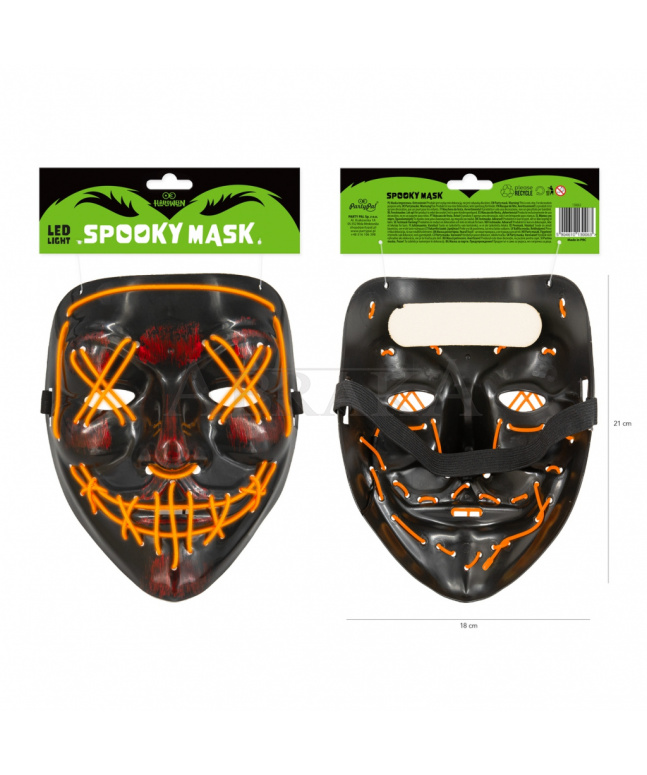 Ide o mimoriadnu masku s LED vláknovou optikou zvýrazňujúcou obrys očí, úst a tváre. Vláknová optika vyžaruje svetlo v oranžovej, žltej, modrej alebo zelenej farbe a je napájaná 2 AA batériami. Vypínač je umiestnený na dlhom kábli a ľahko sa schová napr. Maska inšpirovaná známym hororom The Purge. Batérie nie sú súčašťou balenia.