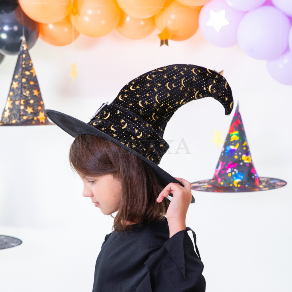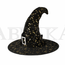 Tento čarodejnícky klobúk je vyrobený z mäkkého čierneho zamatu so zlatými vzormi: mesiace, hviezdy a malé bodky usporiadané v radoch. Jeho charakteristickým znakom je výrazný zaoblený šilt. Vzhľad dotvára stuha s lesklou prackou. Je to jedinečný klobúk pre jedinečnú čarodejnicu. Halloween, karnevaly, divadelné predstavenia, podujatia – kam by ste ho mali nosiť?